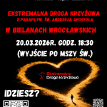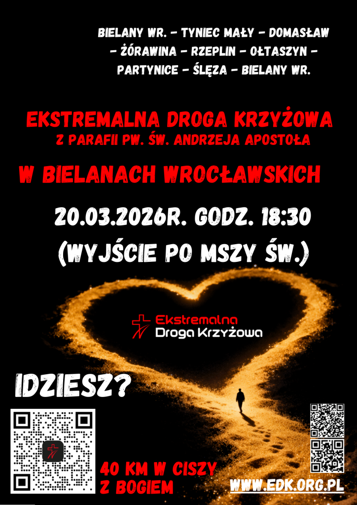 20.03.2026r. po mszy o 18:30 z naszej parafii wyruszy Ekstremalna Droga Krzyżowa (EDK). Uczestnicy podejmą nocne, około 40-kilometrowe wyzwanie na trasie, przeżywając drogę w ciszy, skupieniu i modlitwie.